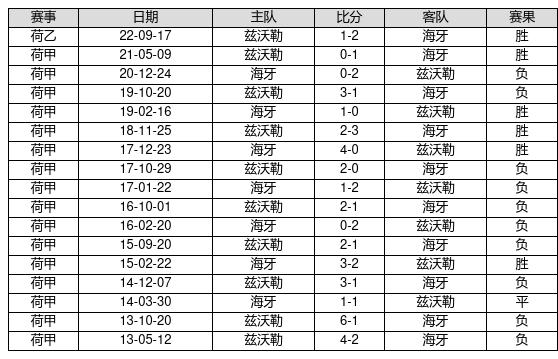 海牙 VS 兹沃勒两队近10年的交战次数为17场,海牙6胜1平10负,赢球概率为35.3%,平局概率为5.9%,输球概率为58.8%。