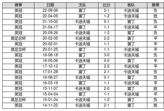 卡迪夫城 VS 雷丁两队近10年的交战次数为18场,卡迪夫城3胜8平7负,赢球概率为16.7%,平局概率为44.4%,输球概率为38.9%。