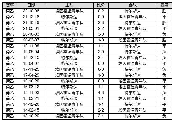 特尔斯达 VS 埃因霍温后生队两队近10年的交战次数为19场,特尔斯达3胜9平7负,赢球概率为15.8%,平局概率为47.4%,输球概率为36.8%。