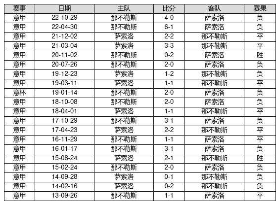 萨索洛 VS 那不勒斯两队近10年的交战次数为20场,萨索洛2胜7平11负,赢球概率为10%,平局概率为35%,输球概率为55%。