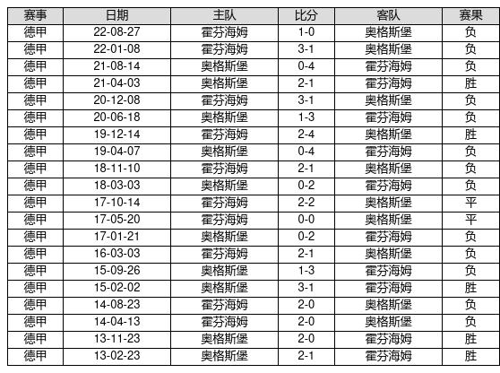 奥格斯堡 VS 霍芬海姆两队近10年的交战次数为20场,奥格斯堡5胜2平13负,赢球概率为25%,平局概率为10%,输球概率为65%。