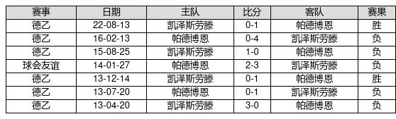 帕德博恩 VS 凯泽斯劳滕两队近10年的交战次数为7场,帕德博恩2胜0平5负,赢球概率为28.6%,平局概率为0%,输球概率为71.4%。