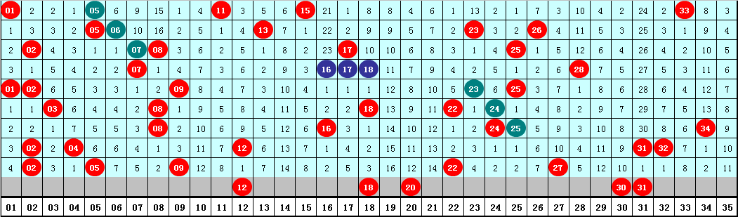 阐明:大乐透前区35个号码,前区每期开出5个奖号,在此以35期为一个周期进行号码的冷温热统计,每个号码平均出现5次,以出现0-3次的号码为冷码,出现4-6次的号码为温码,皇冠博彩网址出现6次以上的号码为热码。后区35期共70个号码,每个号码平均出现5.8次,以出现0-4次的号码为冷码,出现5-7次的号码为温码,出现7次以上的号码为热码。